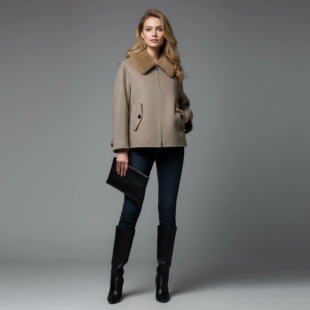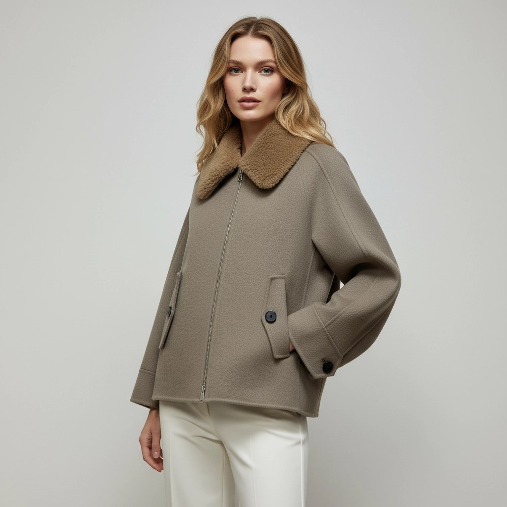Experience the perfect fusion of cozy and chic with our short-length wool coat, designed for a modern, fashion-forward silhouette. Crafted from premium wool, this piece offers structured warmth and a clean drape, while its defining feature—a sumptuous, plush teddy faux fur collar—adds a touch of playful texture and luxurious comfort. The practical full-zip closure provides a sleek, contemporary alternative to traditional buttons, allowing for easy wear and a customizable look. Finished with long sleeves and a cropped length that pairs perfectly with high-waisted styles, this coat is a standout piece for cool-weather style.