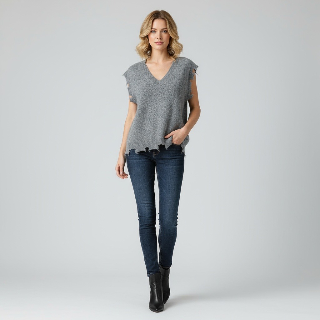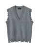 Challenge conventional style with this boldly crafted wool vest, where luxury meets an undone, avant-garde edge. Meticulously constructed from high-quality wool, its raw, deconstructed finish features intentionally frayed and distressed detailing along the armholes and hem. This deliberate ‘destroyed’ treatment creates a textural, rebellious silhouette that is both tactile and visually striking. The sleeveless design ensures versatile layering, making it the ultimate statement piece for those who express their style with fearless individuality and a touch of anarchic sophistication.