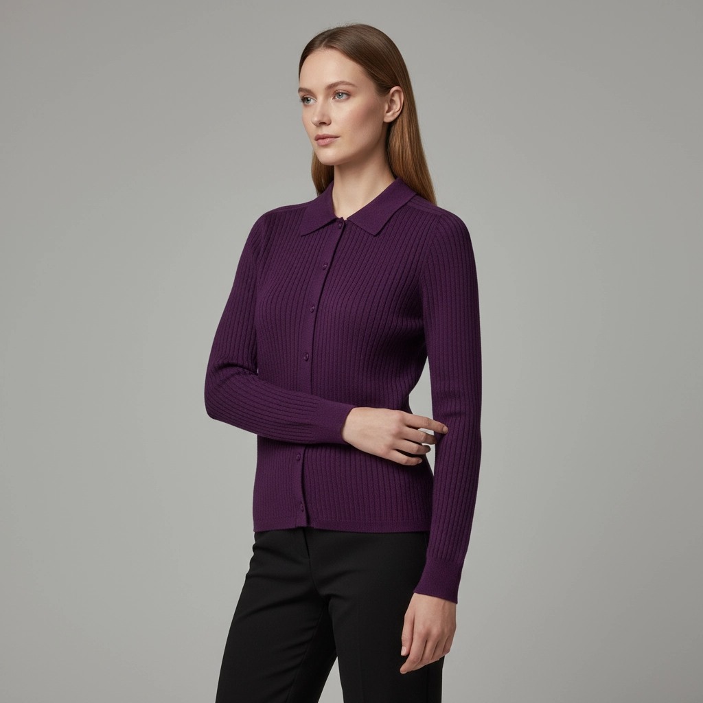 Embrace a look of refined, intellectual charm with this deep purple wool knit cardigan. Crafted from soft, premium wool, this piece offers lightweight warmth and a comfortable, polished drape. The design features a sophisticated pointed collar and a full button-front closure, evoking the timeless appeal of classic tailoring, but rendered in the cozy comfort of a knit. The rich, regal purple hue adds a touch of depth and sophistication, while the rib-knit trims at the cuffs and hem provide a clean, structured finish and ensure an optimal fit. A versatile piece that effortlessly bridges the gap between smart and casual.