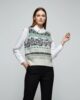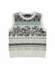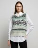 A masterpiece of texture and pattern, this knit vest is crafted from a premium wool woven with a subtle metallic thread. The a classic color-block pattern, over which delicate floral motifs are artfully embroidered, creating a rich, dimensional tapestry. The unique rounded neck offers a soft, flattering frame for the collarbone. This piece is a true statement, merging artisan craft with a touch of modern shimmer.