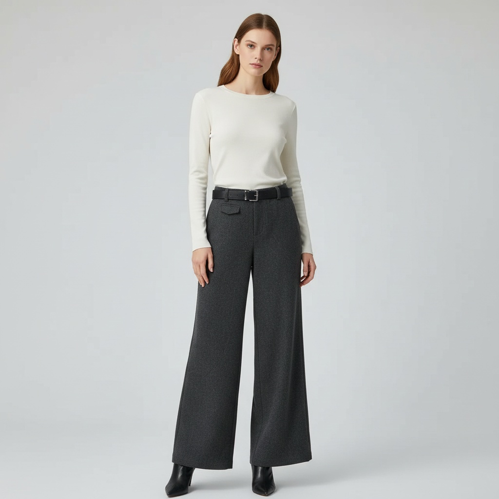 Command effortless elegance with our grey wool blend wide-leg trouser, a piece that masterfully balances relaxed sophistication with tailored detail. Crafted from a premium wool blend fabric, it offers softness, comfortable warmth, and a beautiful, fluid drape that moves with the grace of the wide-leg silhouette. The design features a clean high-rise waistband in a contrasting black, creating a sharp, defining line that enhances the figure. Adding a touch of utilitarian chic is a single faux pocket flap on the left front leg—a subtle, asymmetrical detail that breaks the minimalist line with intention. A versatile statement piece for the modern wardrobe.