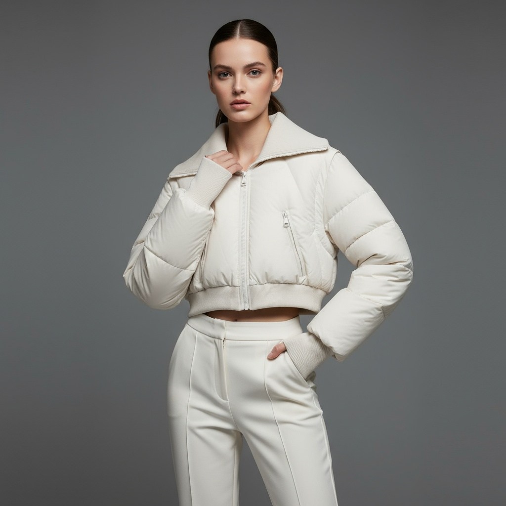 Redefine winter fashion with this statement-making high-waisted puffer jacket, where dramatic design meets cozy warmth. The jacket is instantly recognizable by its bold, oversized lapel collar that frames the face with architectural flair and adds a touch of sophisticated volume. Its most striking feature is the ultra-cropped, high-waisted silhouette that hits just above the natural waist, creating a playful, modern proportion that pairs perfectly with high-rise trousers or long skirts. Secured with a sleek, full-length zip closure, this piece offers a streamlined look while delivering reliable insulation. A must-have for those who see cold weather as an opportunity for bold style expression.